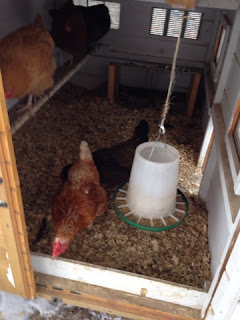 The freezing temps do cause a bit of a problem, though. Yesterday, we noticed the chickens hadn't come out all day. Their food is in the coop because the moisture ruins it, but their water is outside sitting on a cinder block that has a 100 watt light bulb inside to keep it from freezing. I put their water in the coop to see if they were thirsty and they all swarmed. So, I decided to leave it in there for the night.